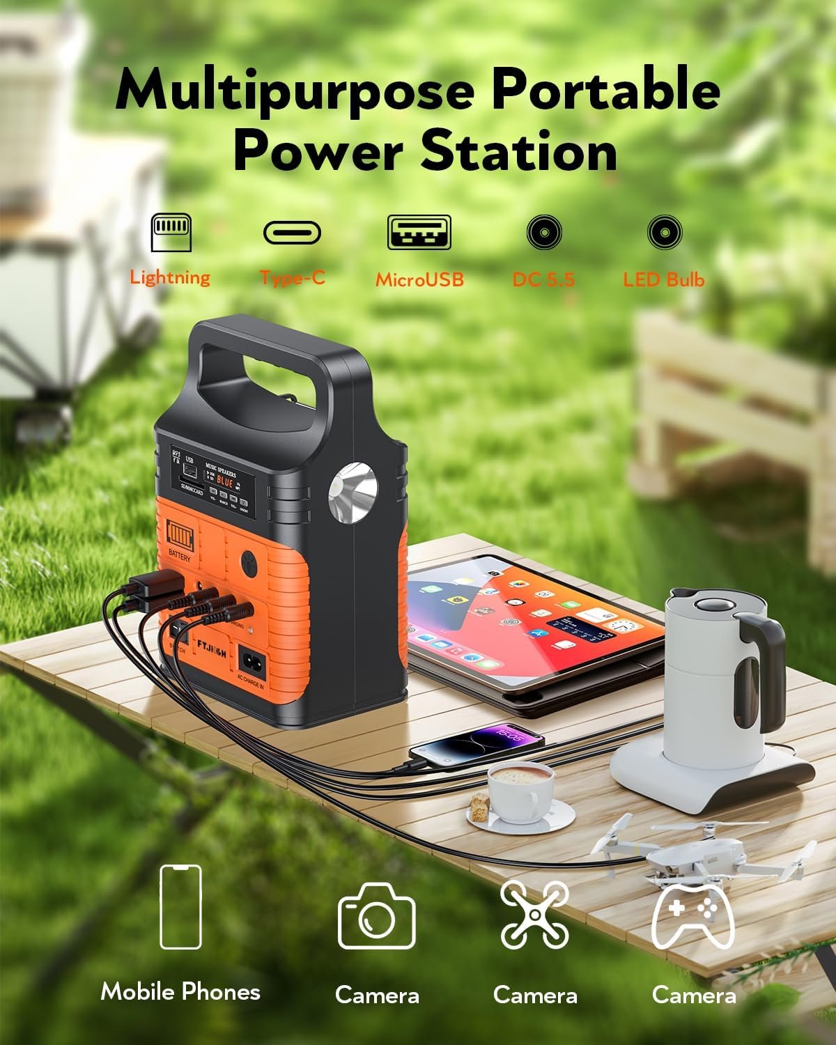 Portable power station with multiple charging ports, connected to tablet and smartphone. Icons show compatibility with MicroUSB, DC 5.5, LED Bulb, Lightning, and Type-C connectors.Portable power station with multiple charging ports, connected to tablet and smartphone. Icons show compatibility with MicroUSB, DC 5.5, LED Bulb, Lightning, and Type-C connectors.