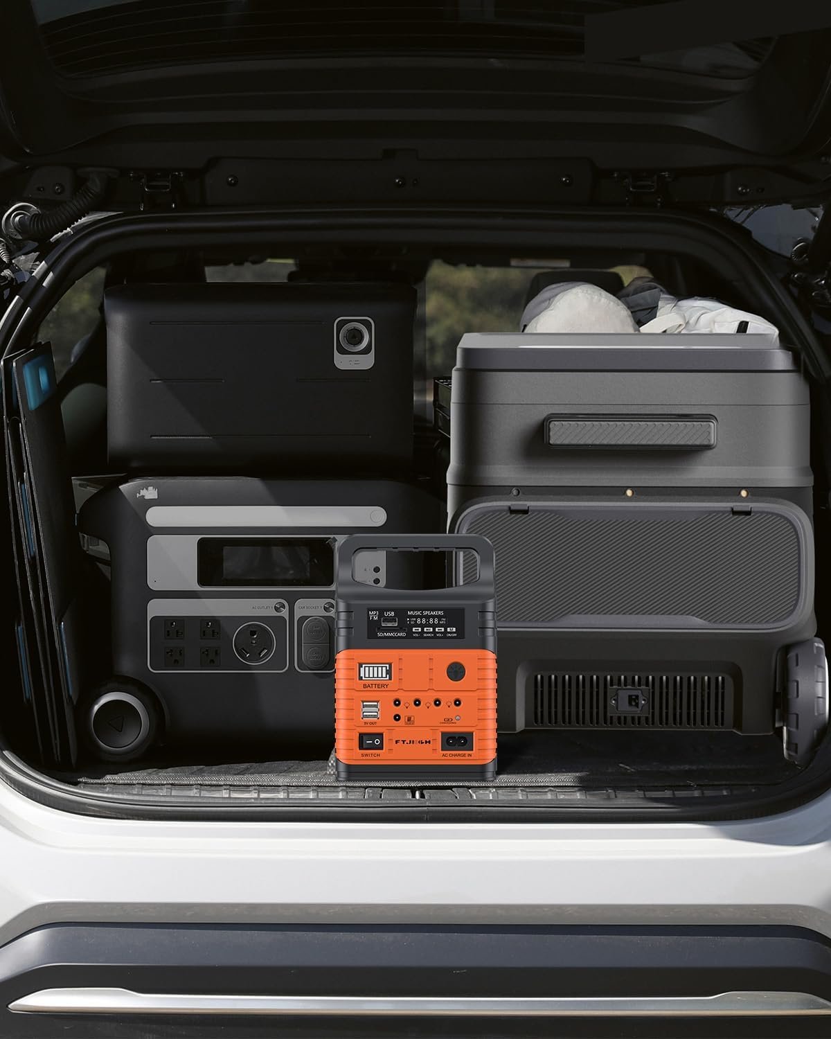 Portable power station with orange display panel shown in three charging scenarios: car charging, AC outlet charging, and solar panel charging outdoors.Portable power station with orange display panel shown in three charging scenarios: car charging, AC outlet charging, and solar panel charging outdoors.