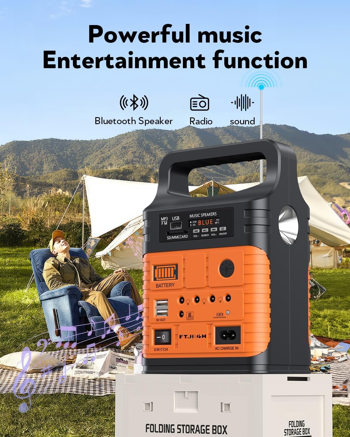 Portable power station with music speaker and Bluetooth capabilities shown next to an RV camping scene with people using a smartphone app for control.Portable power station with music speaker and Bluetooth capabilities shown next to an RV camping scene with people using a smartphone app for control.