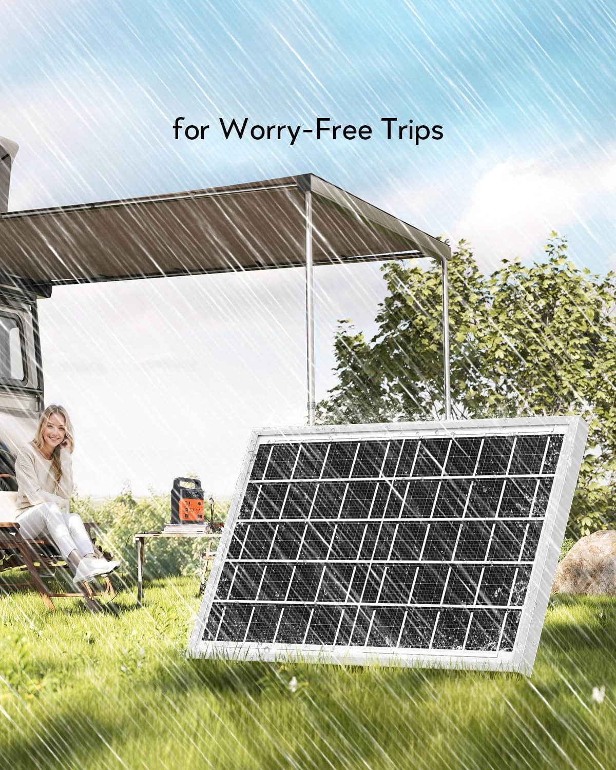 Portable power station with solar panel outdoors. Orange device next to folding solar panel. Person sitting in camping chair by lake, demonstrating off-grid power use.Portable power station with solar panel outdoors. Orange device next to folding solar panel. Person sitting in camping chair by lake, demonstrating off-grid power use.