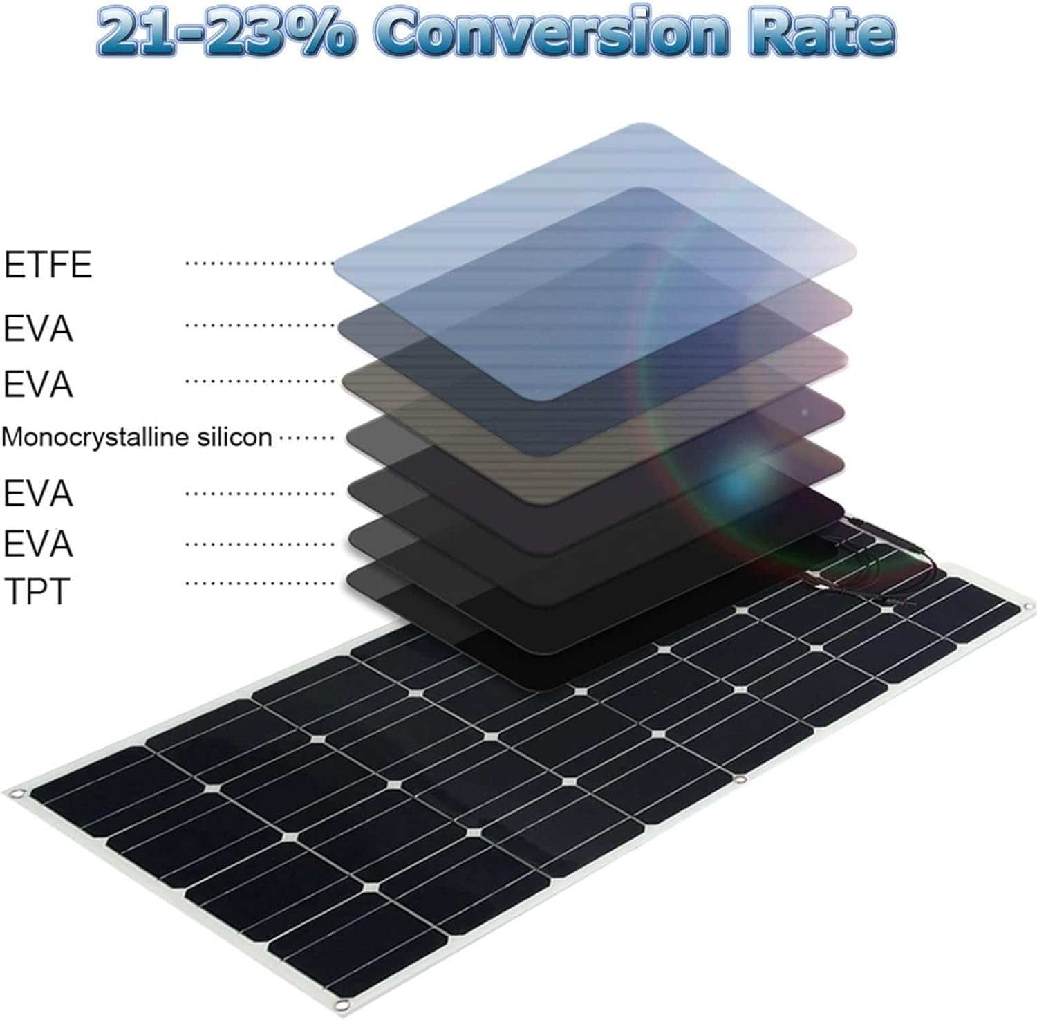 【Durable & Easy To Clean】Outermost layer of the solar panel adopts PET film packaging technology, which is IP65 waterproof and easy to clean. The solar panel adopts 5-layer principle technology, which has strong tear resistance, high tensile strength, good hardness, excellent impact resistance, and long stretch life.