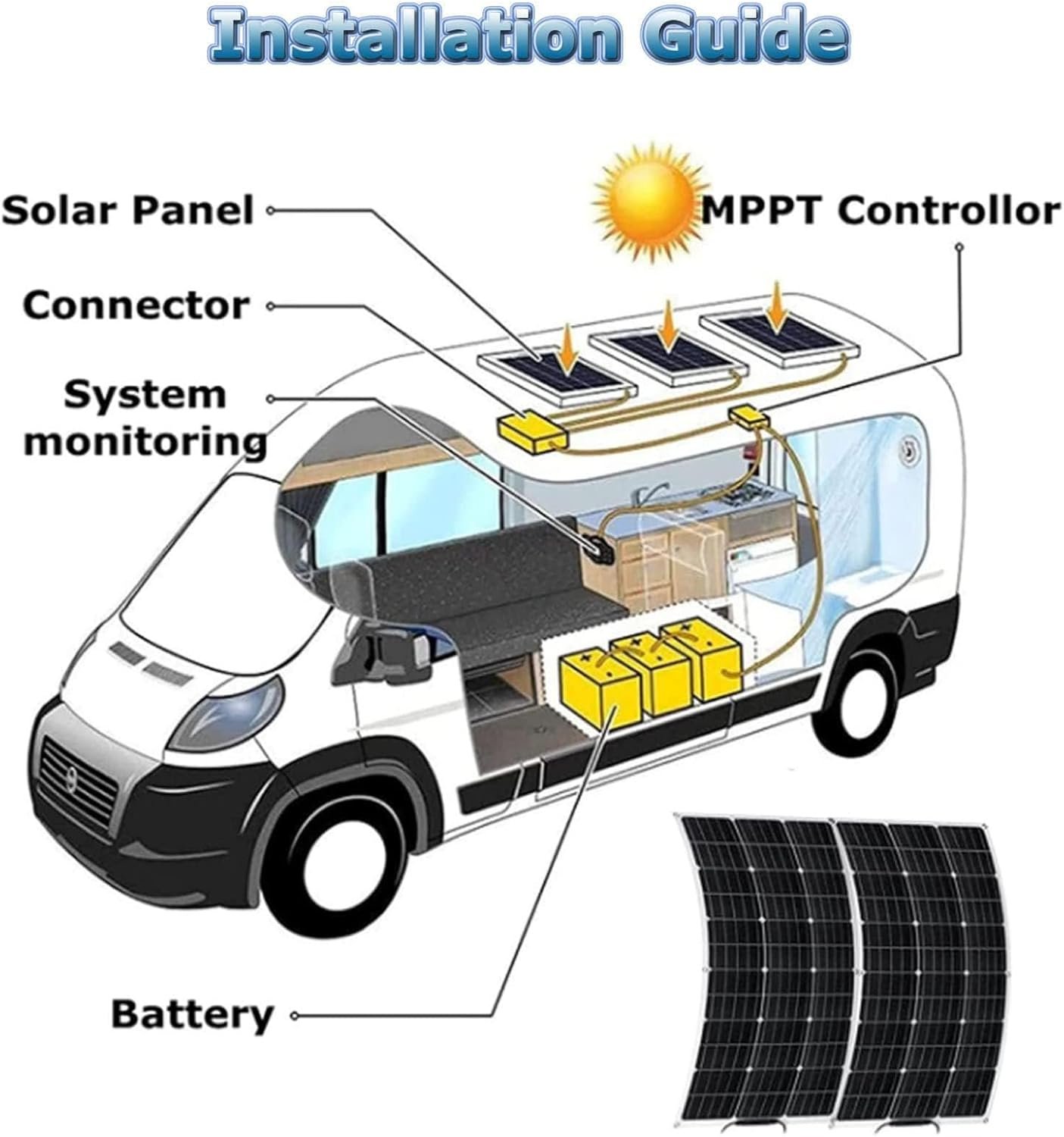 【Scope of Application】This solar panel kit is perfect for RV, boat, sail, yacht, truck, car, coach, cabin, RV, tent, trailer, golf cart or any other uneven surface.
