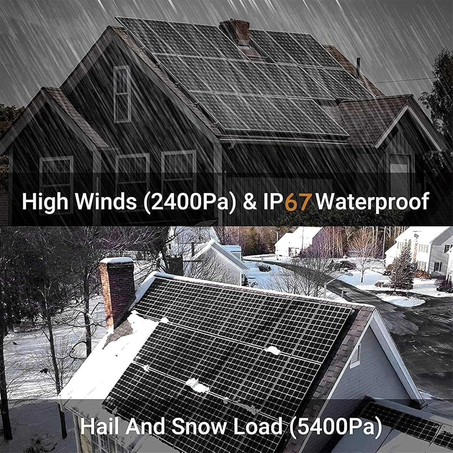 【Built to Last】Withstands high winds (2400Pa) and snow loads (5400Pa). Aluminum frame provides extended outdoor use that ensures the panel can last for decades. The IP65 rated junction box is versatile due to its ability to withstand dirt, dust, debris, and low-pressure water jets.