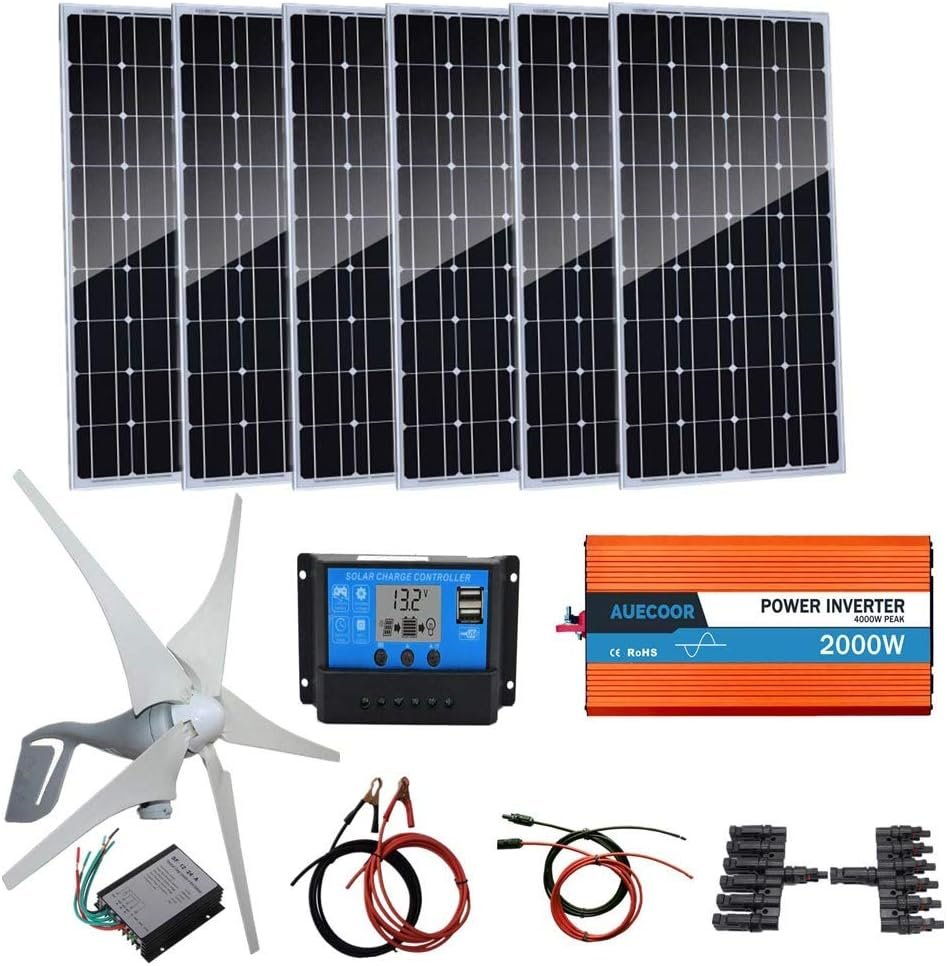 AUECOOR 1000 Watts Wind Solar Powered System(Hybrid System Kit): 400W Wind Turbine Generator + 6pcs 100W Monocrystalline Solar Panel + 2000W Pure Since Wave Inverter(Peak 4000W)+Accessories
