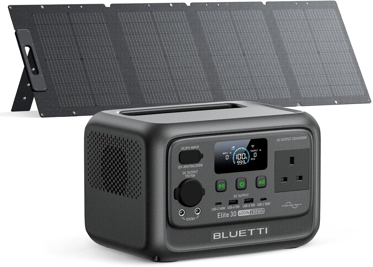 BLUETTI Solar Generator Elite 30 V2 with 120W Solar Panel (Ships Separately), 288Wh LiFePO4 Portable Power Station, 600W AC Outlets (1500W Power Lifting), for Camping, Home Use, Emergency