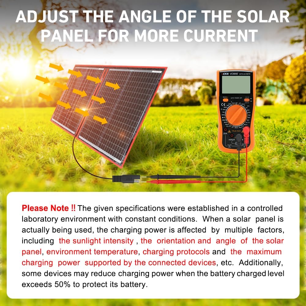 Please Note: If you want to test the actual power generation of solar panel, please use a multimeter. Because some portable power stations have a maximum input power limit. Even when using our solar panel in optimal sunlight conditions, the power they can receive won’t exceed their maximum input power limit, but this does not indicate that our solar panel has insufficient power output.