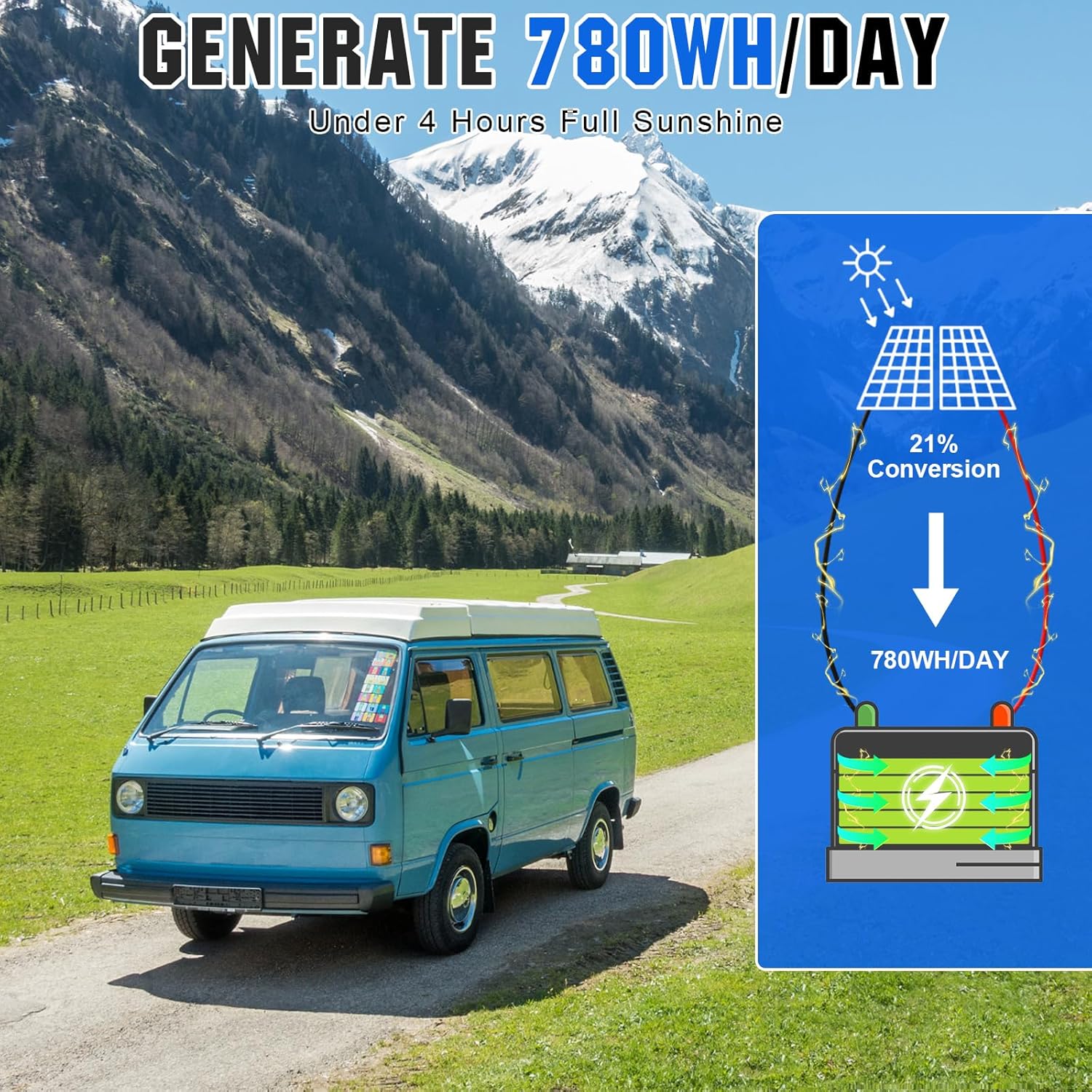 Output Power 0.78kWh per day:This solar panel system can generate 780Wh per day in full sunshine, perfect for motorhome, caravan, RV,boat and emergency power supply