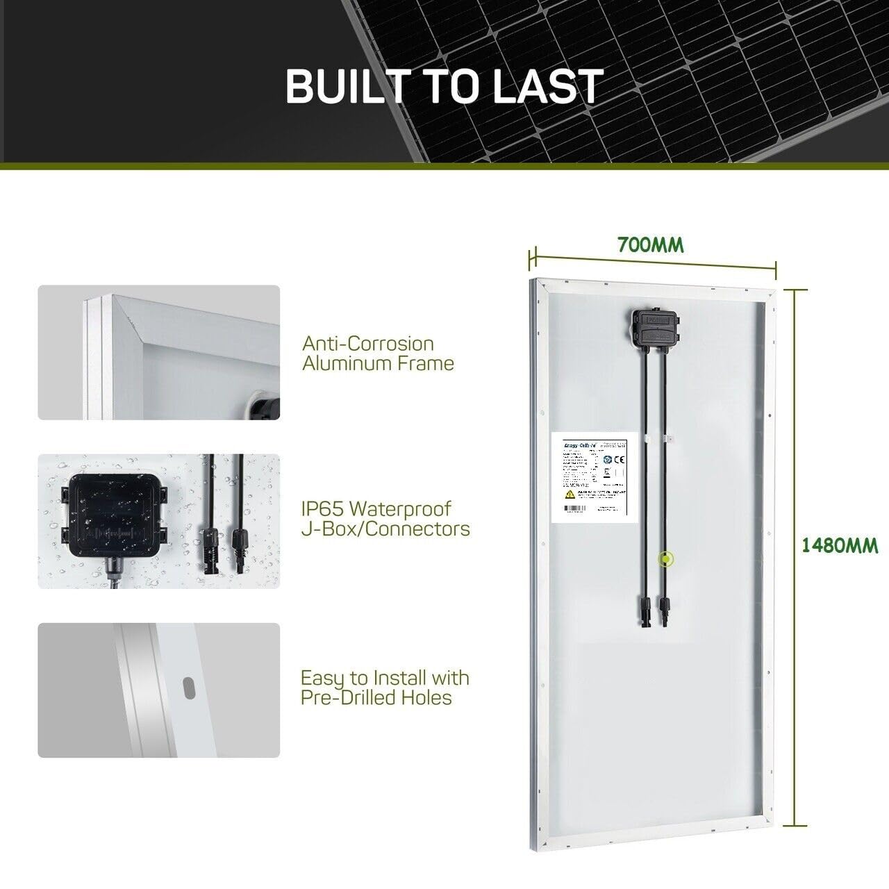 【Built to Last】Enogy-Cells-Ni solar panel with corrosion-resistant aluminum frame provides extended outdoor use that ensures the panel can last for decades. Withstand high wind (2400Pa) and snow loads (5400Pa). IP65 rated junction box and IP68 rated solar connector offer complete protection against environmental particles and low-pressure water jets.