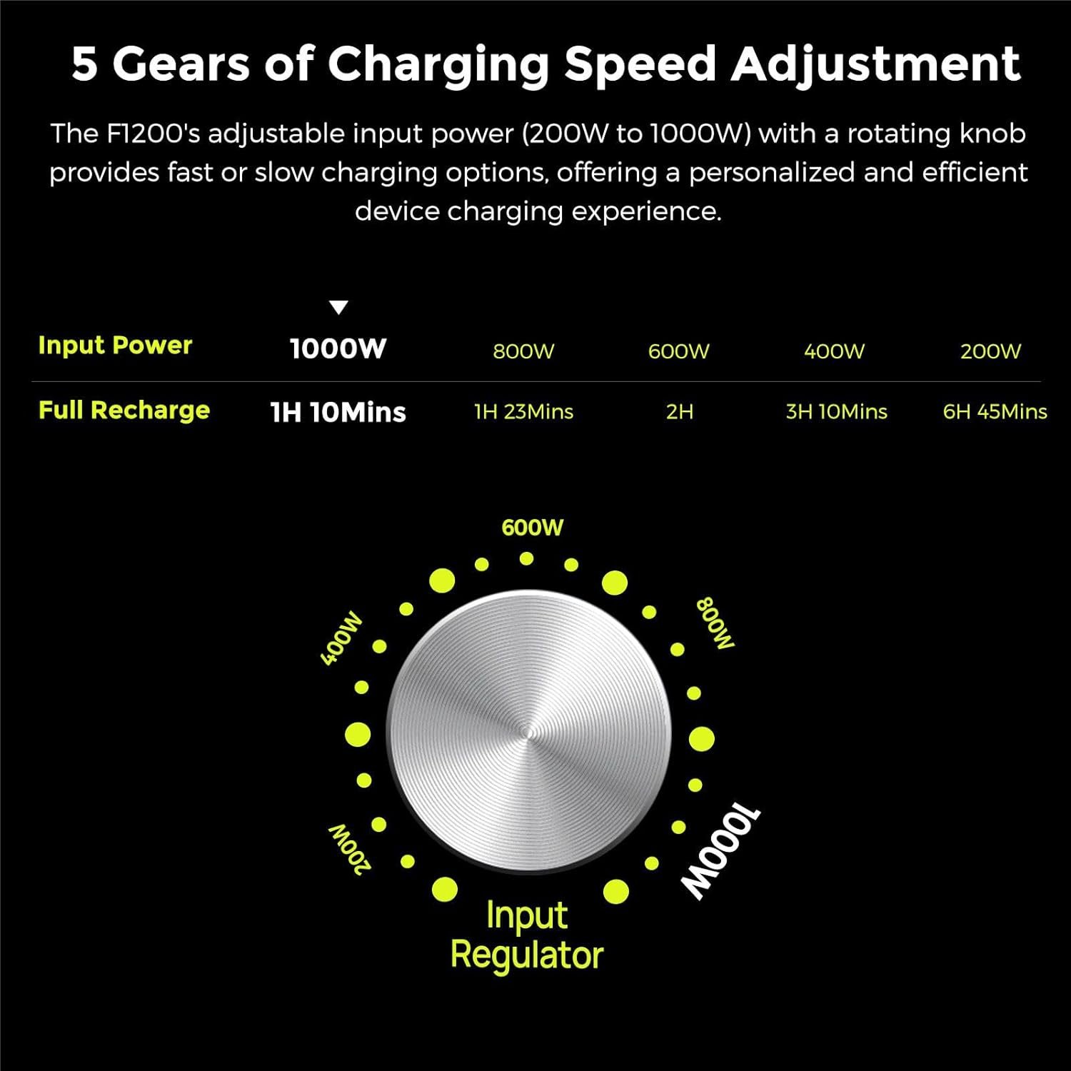 【5 charging speeds】 Power station devices are designed with knobs for adjustable input power (200W to 1000W), allowing for fast or slow charging and providing a personalized and efficient charging experience