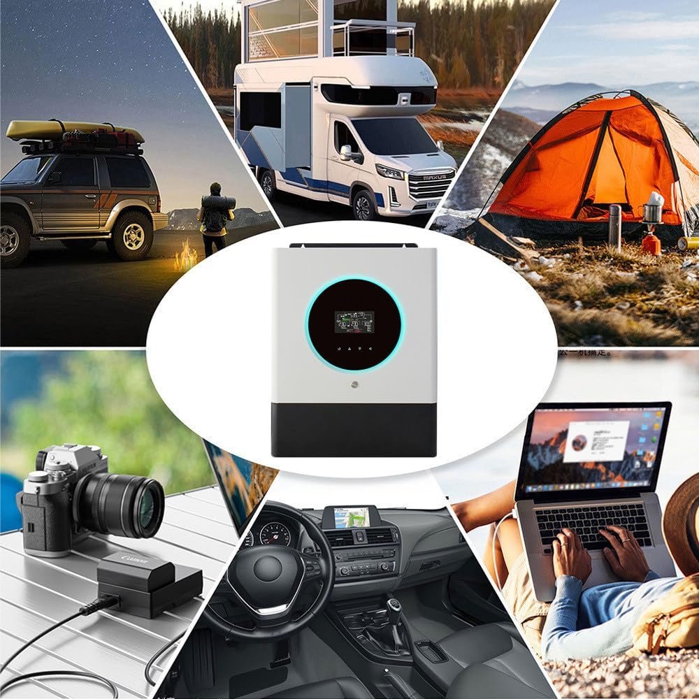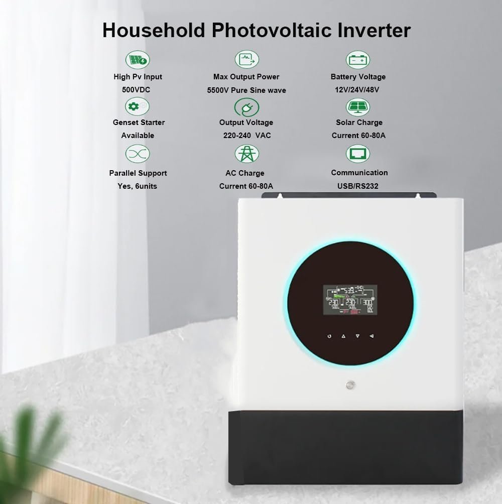 This inverter has a built-in 60-80A MPPT controller and is mainly used for photovoltaic (PV) power generation, converting 12V/24V/48V direct current (DC) generated by photovoltaic panels into 220-240V alternating current (AC) to power homes and businesses.
