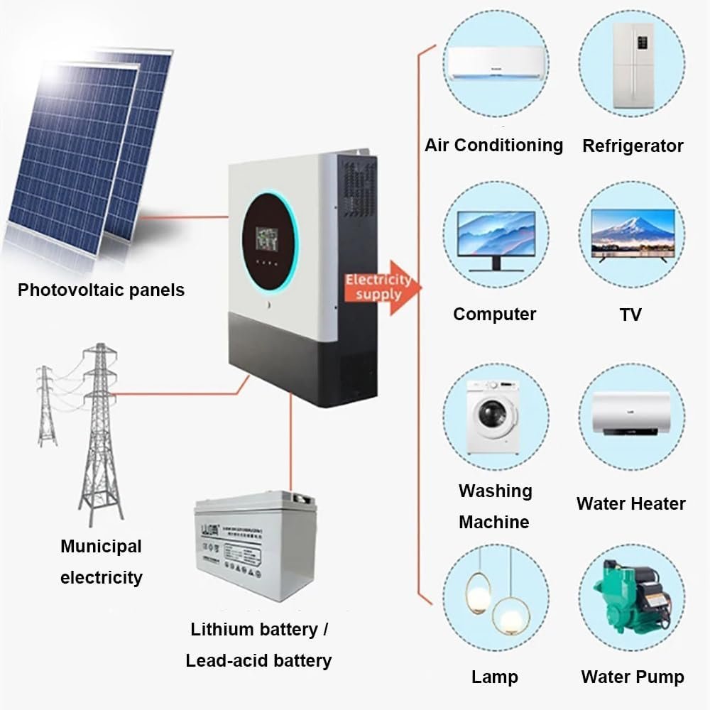 This solar hybrid inverter can power a variety of home or office equipment, including lighting, fans, refrigerators and air conditioners. It is compatible with solar, mains, diesel/gasoline generator power supply, and can meet the needs of various home and office loads.
