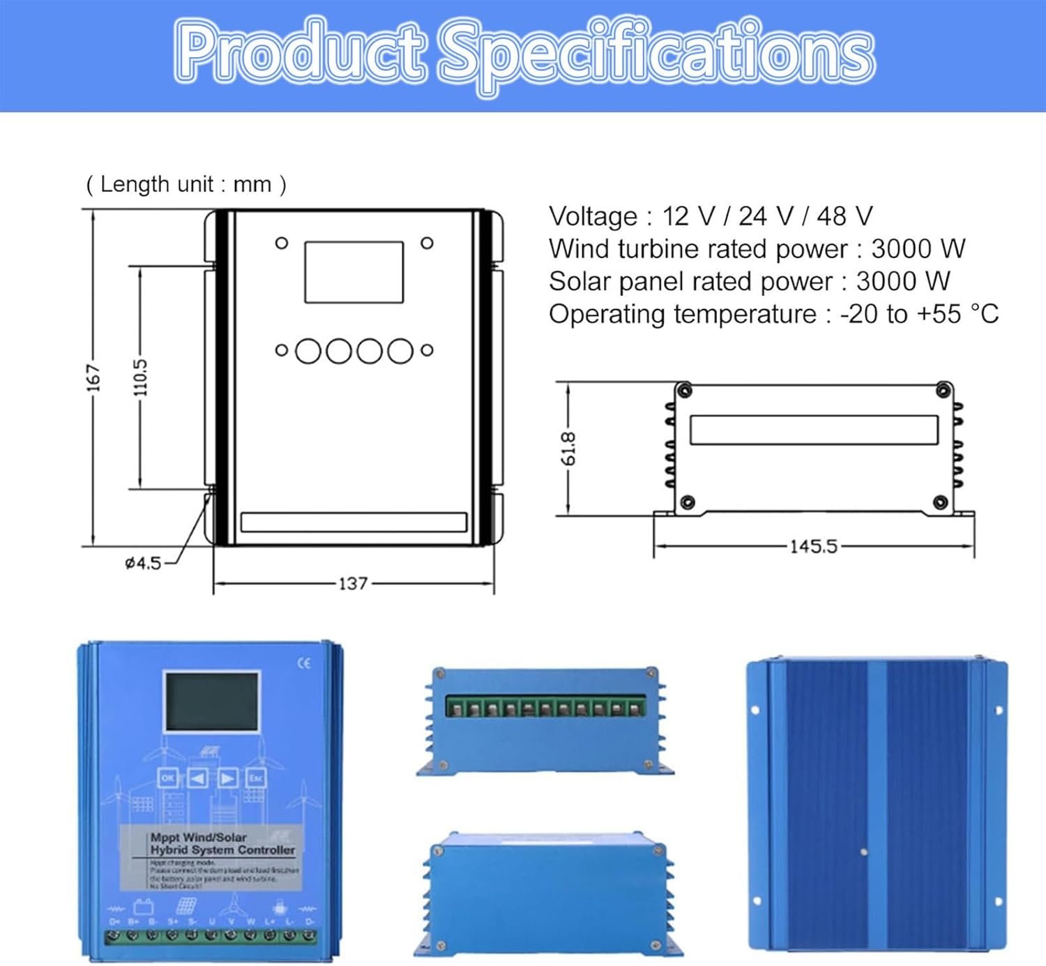 ➤【Scope of use】The wind and solar hybrid controller charge controller is compatible with all 12V/24V/48V batteries. It is suitable for lithium, lead-acid, gel and other battery types. It is used for wind turbines and solar panels. It can be used in homes, boats, and street lights. The wind and solar complementary systems. Hybrid boost charging solar wind charging regulator. Wind turbine solar charger. MPPT voltage regulator