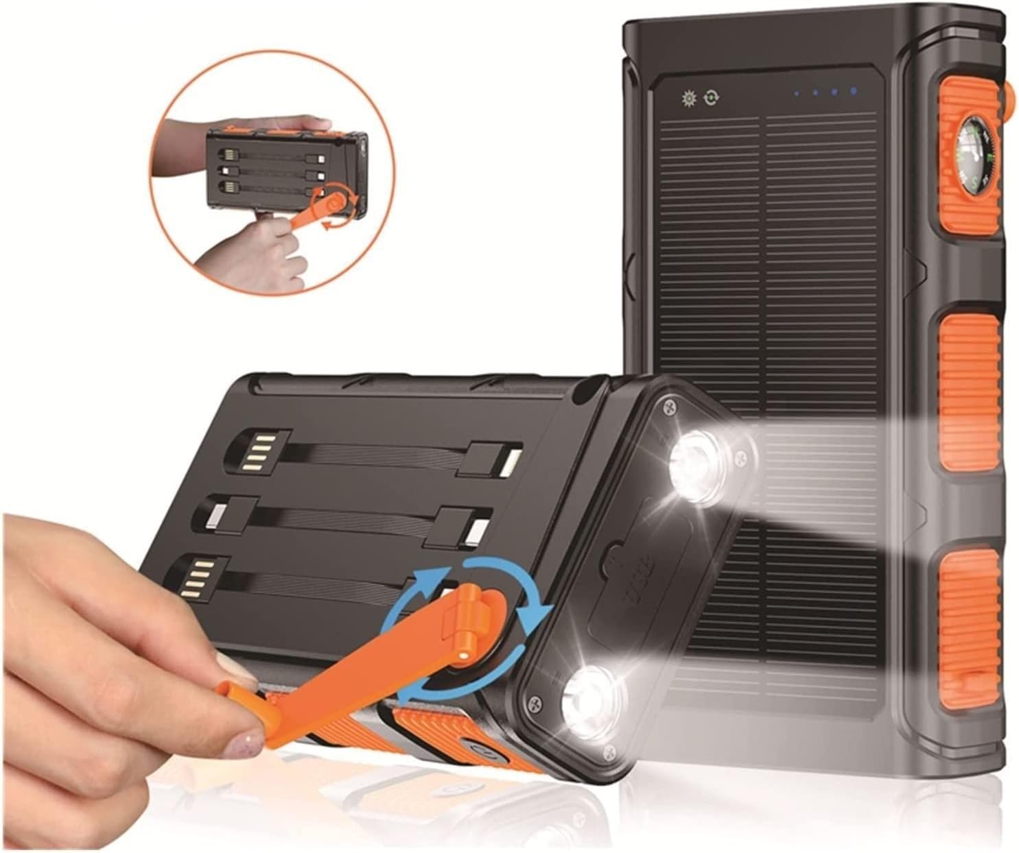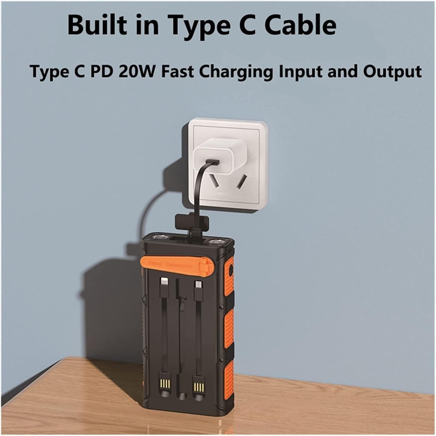 Specification:Product name: Solar Power Bank with Hand ChargingProduct size: 172*89*39.5mmWeight: Color: orange, black,red, blue, green, grayFeatures:Support PD 20W Fast ChargingSupport Type C Fast Charging Input and OutputSupport Hand ChargingSupport Solar ChargingSupport USB ChargingBuilt in CableWith Strong LED FlashlightWith Solar PanelWith CompassPackage Included:1x Solar Power Bank1x Cable1x User Manual