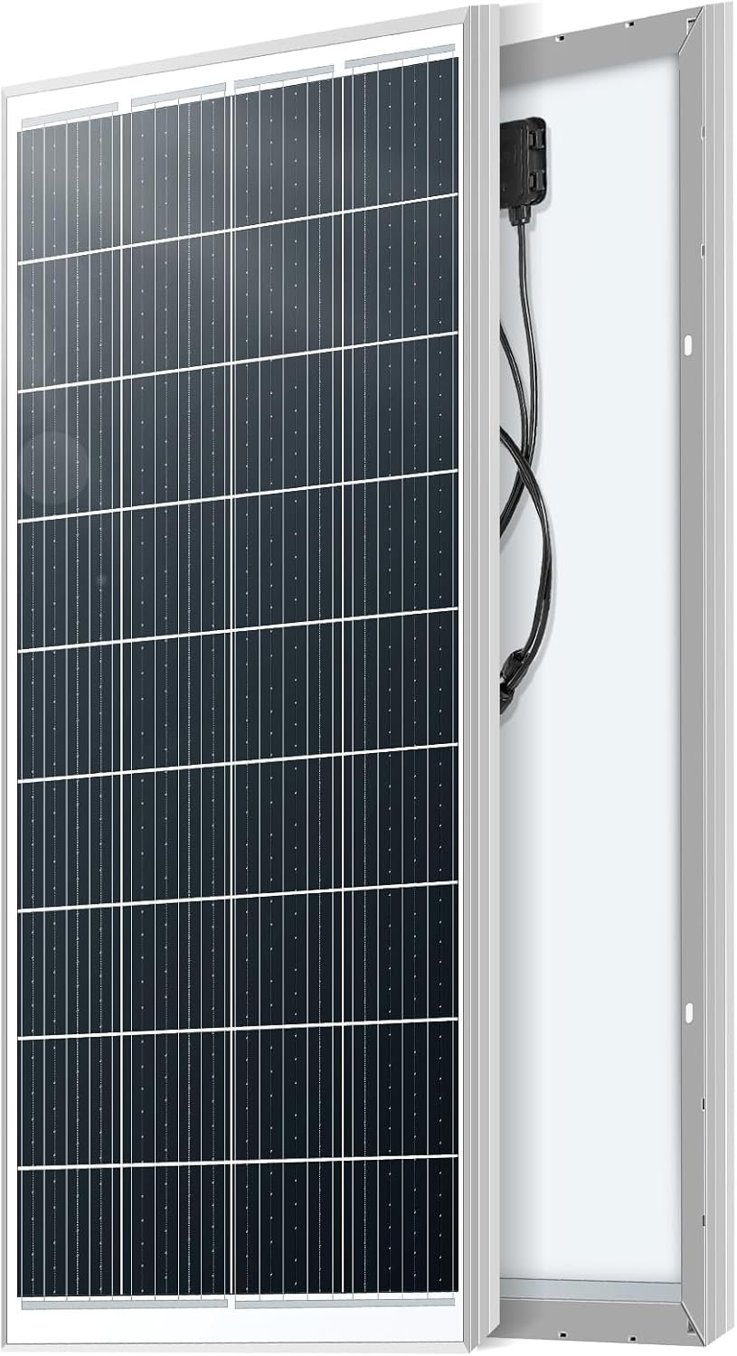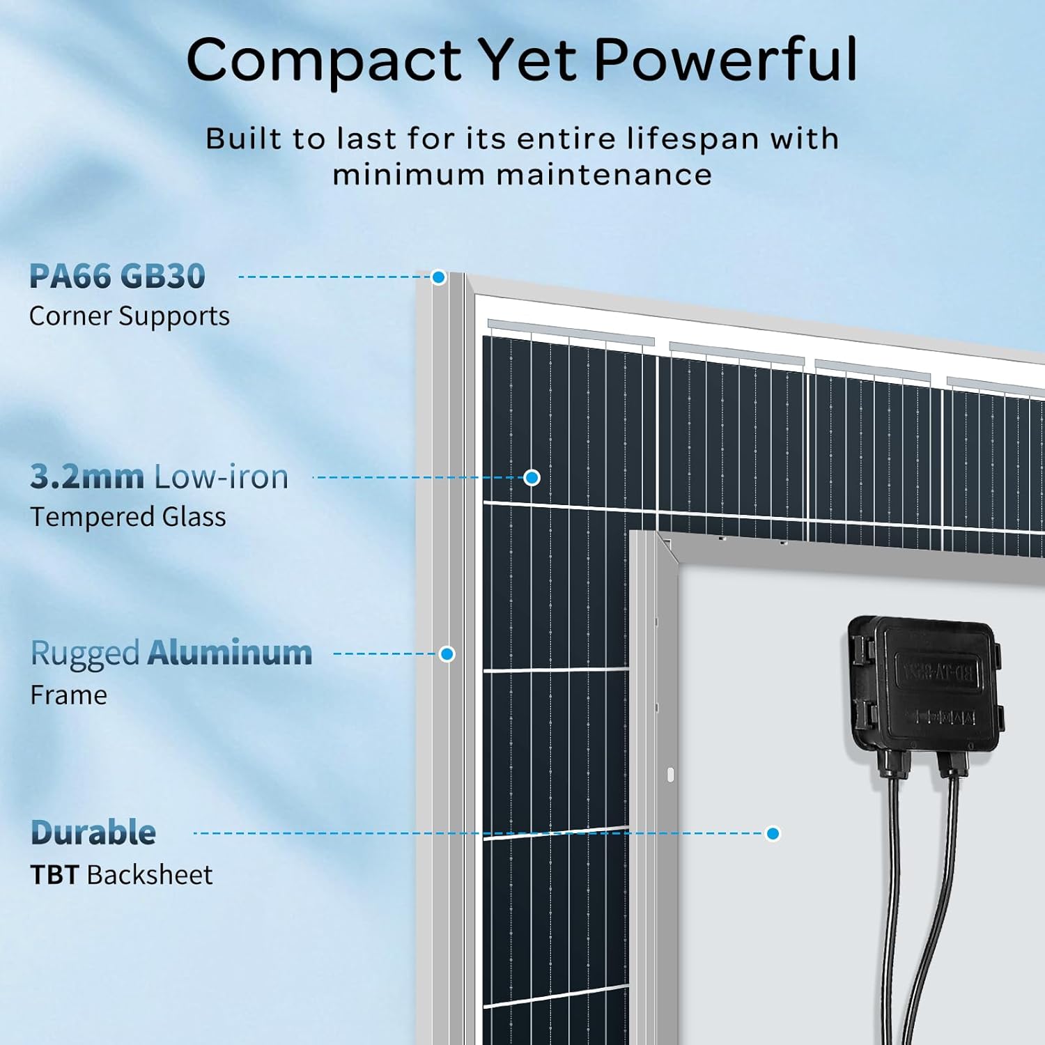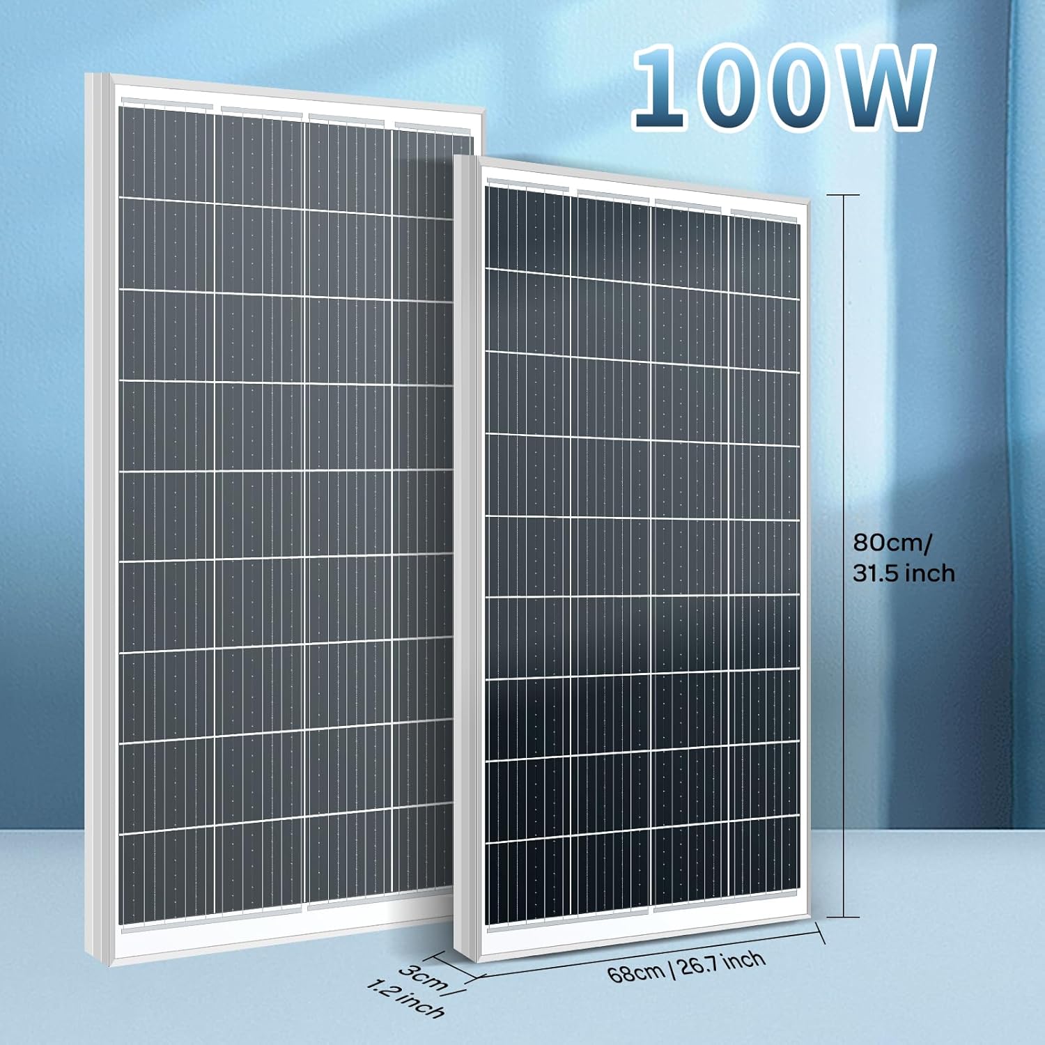 VERSATILE USAGE: The 100W solar panel delivers up to 500Wh power daily under optimal sunlight, making it ideal for motorhomes, boats, caravans, sheds, trailers, golf carts, and more. Built with Grade A+ monocrystalline solar cells, ensuring high conversion efficiency and long-term reliability.