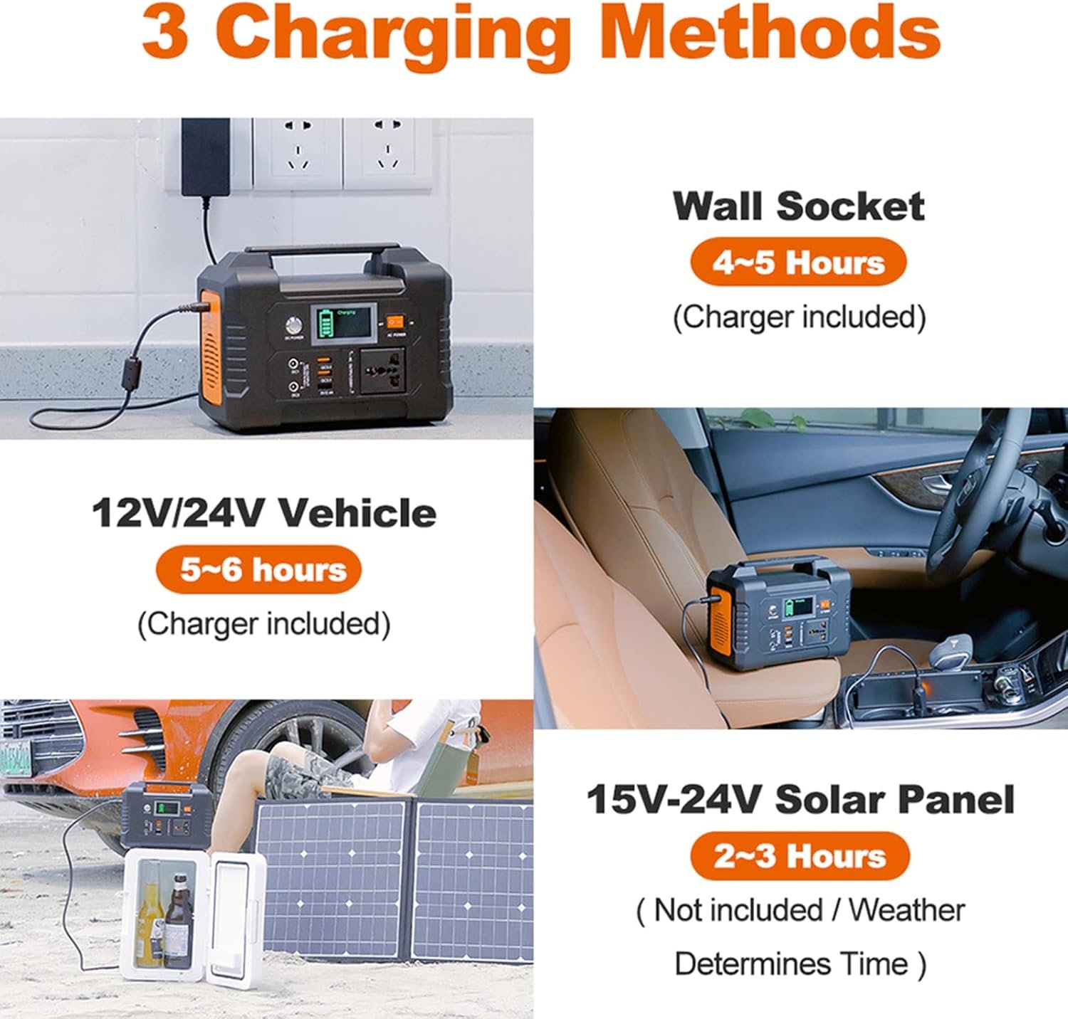 TRIPLE RECHARGEABLE MODES EFFICIENT SOLAR GENERATOR: Power station is equipped with a lithium battery pack, it can be charged by the 15-24 volt solar panel (not included), AC wall adapter and car charger efficiently. No memory effect, no worry about battery capacity reduction.