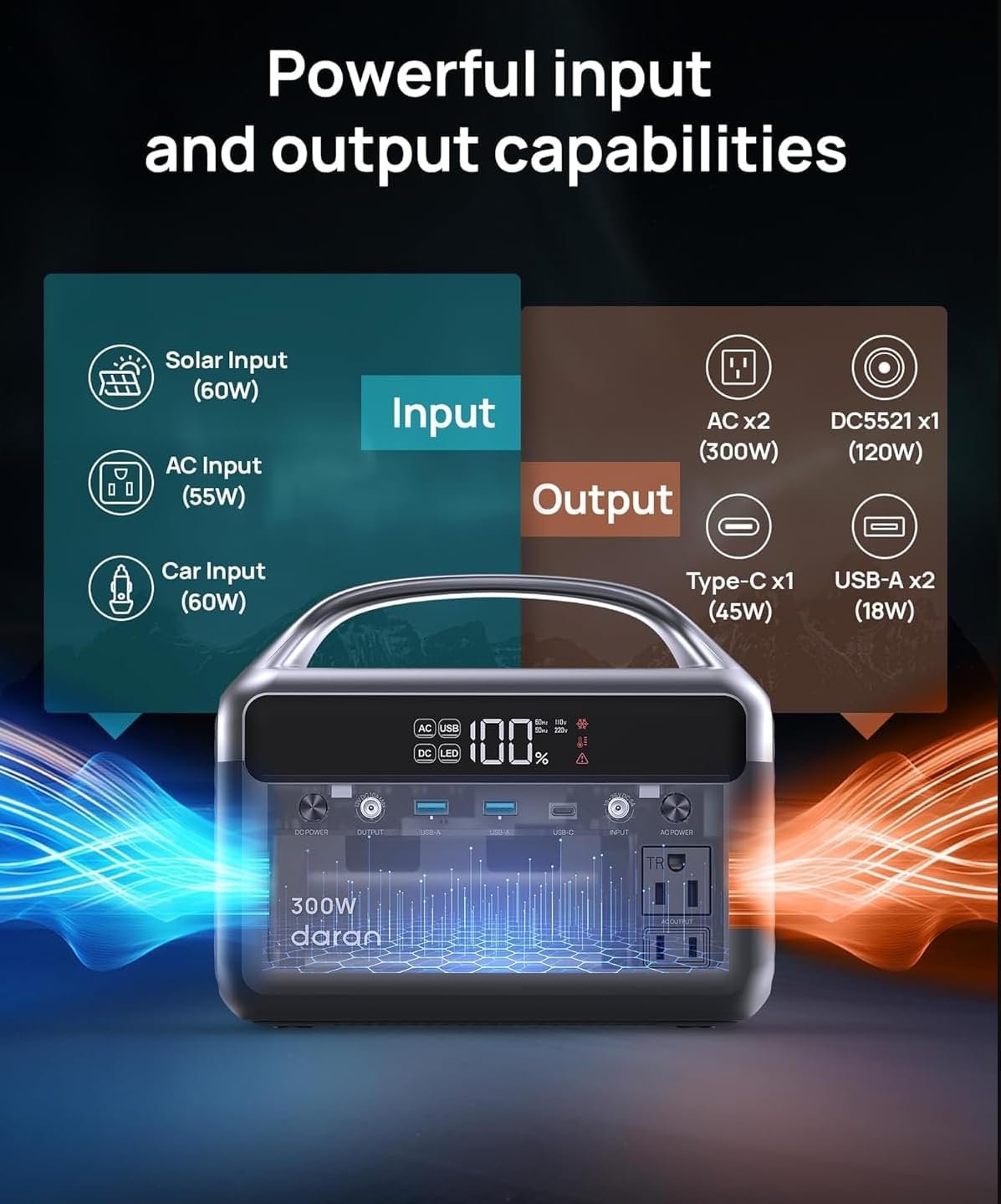 POWER OUTPUT: 300W continuous power (600W surge) with multiple output ports for charging various devices simultaneously