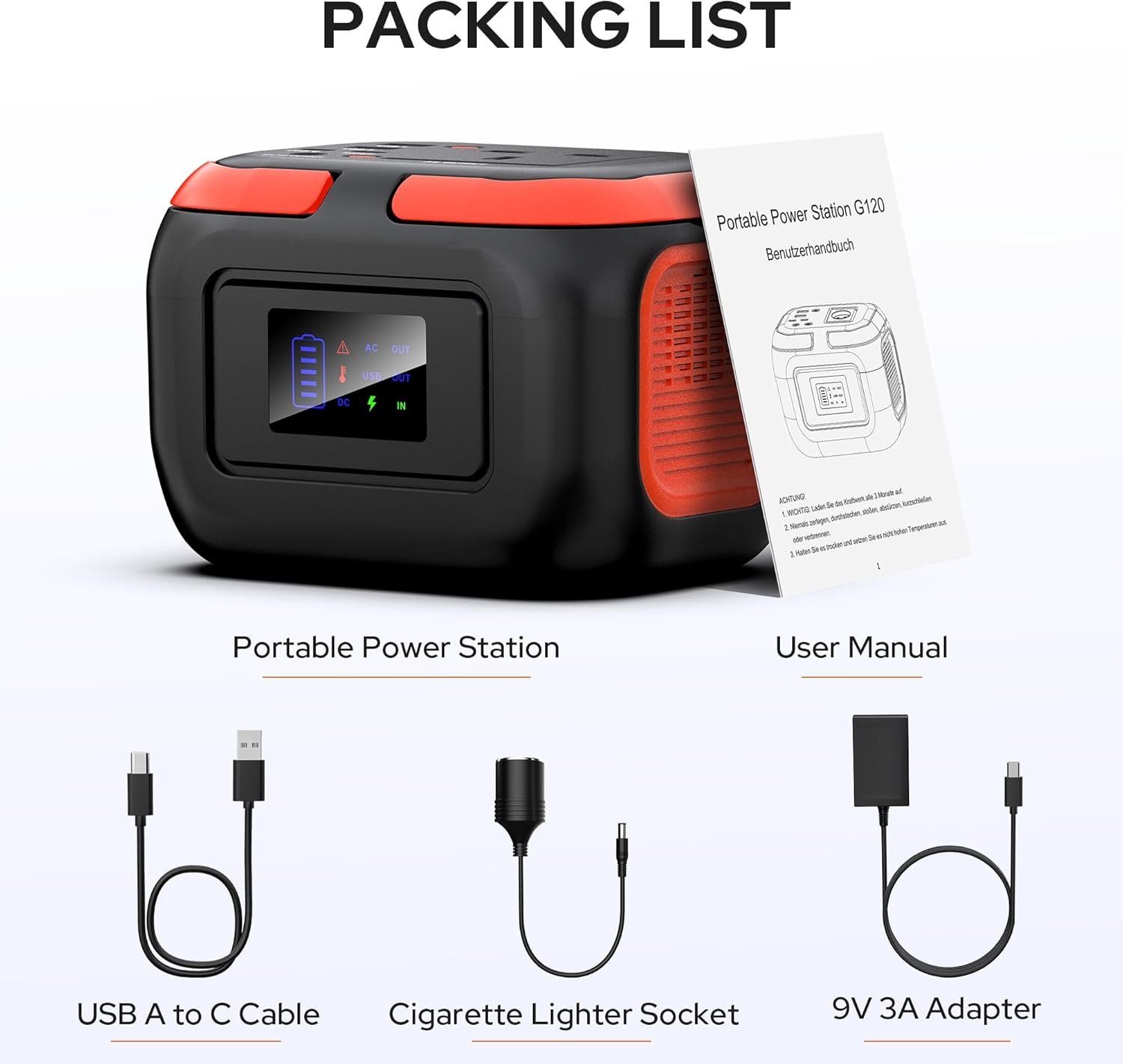Model G120-OR Capacity 97.68 WH (26400mAh 3.7V) USB-C input 9V 3A Max (27W) Charging time Approx. 4~5 hours AC output 230V 50Hz, 120W Max DC output 12~16,8V 6A Max(72W~100W) USB-A 1 output 5V 2A (10W) USB-A 2 output 5V 3A / 9V 2A /12V 1.5A (QC 18W) USB-C output 5V 3A / 9V 2A /12V 1.5A (QC 18W) LED light mode Strong light, soft light, SOS mode
