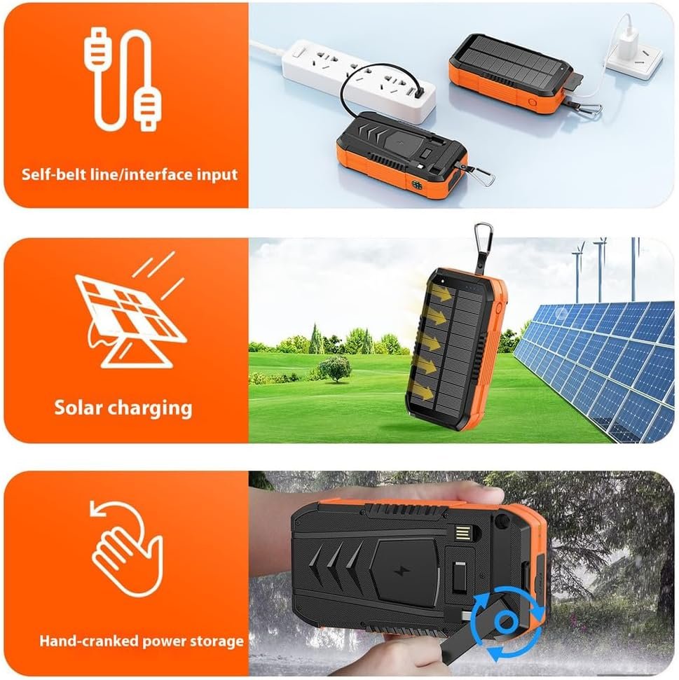 Versatile charging options include self-wired, hand-cranked, and solar methods, plus a compass for charging electronic devices without power limitations.