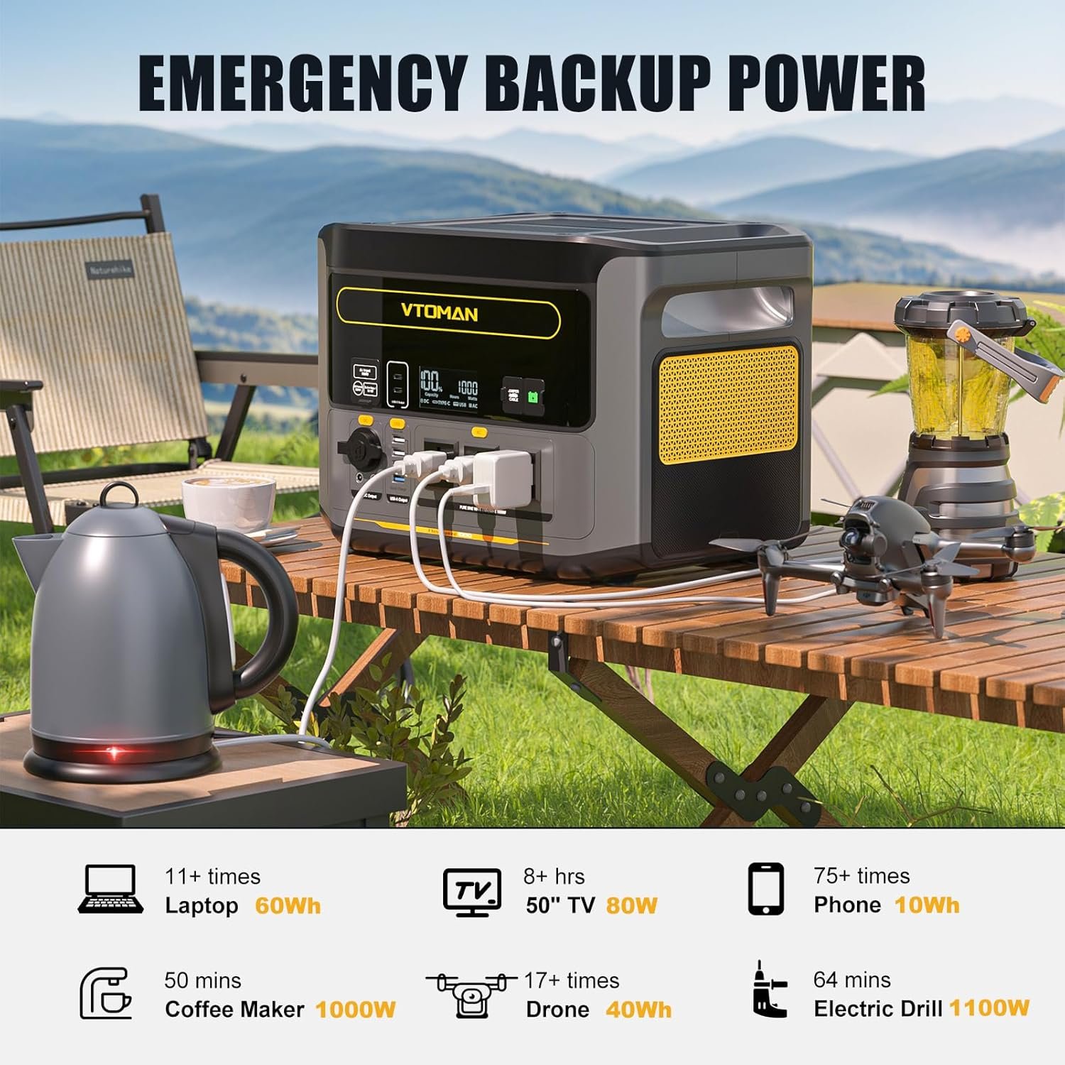 【V-BEYOND Tech】VTOMAN’s exclusive technology boosts the 1000W AC inverter to support devices over 1000W, with a 2000W surge peak. Perfect for power tools, appliances, outdoor adventures, and emergencies.