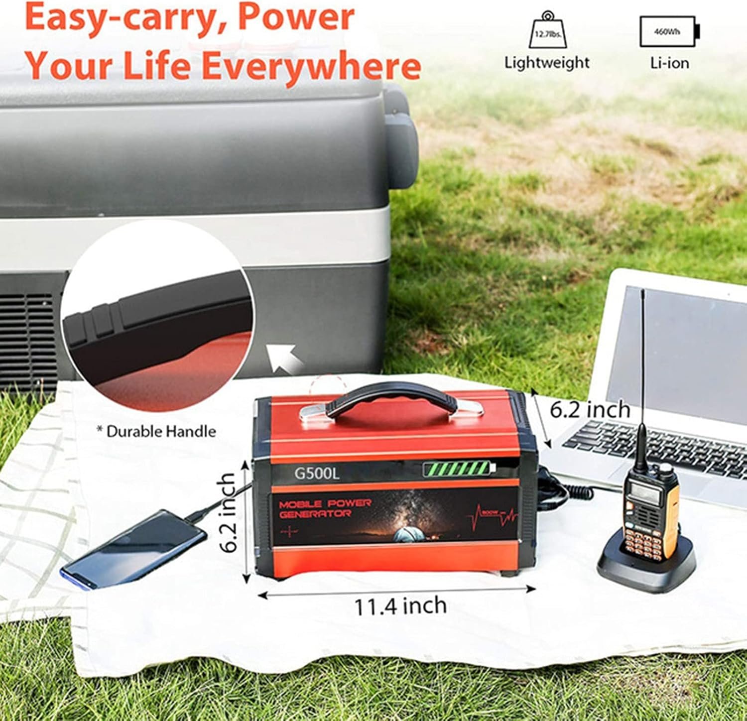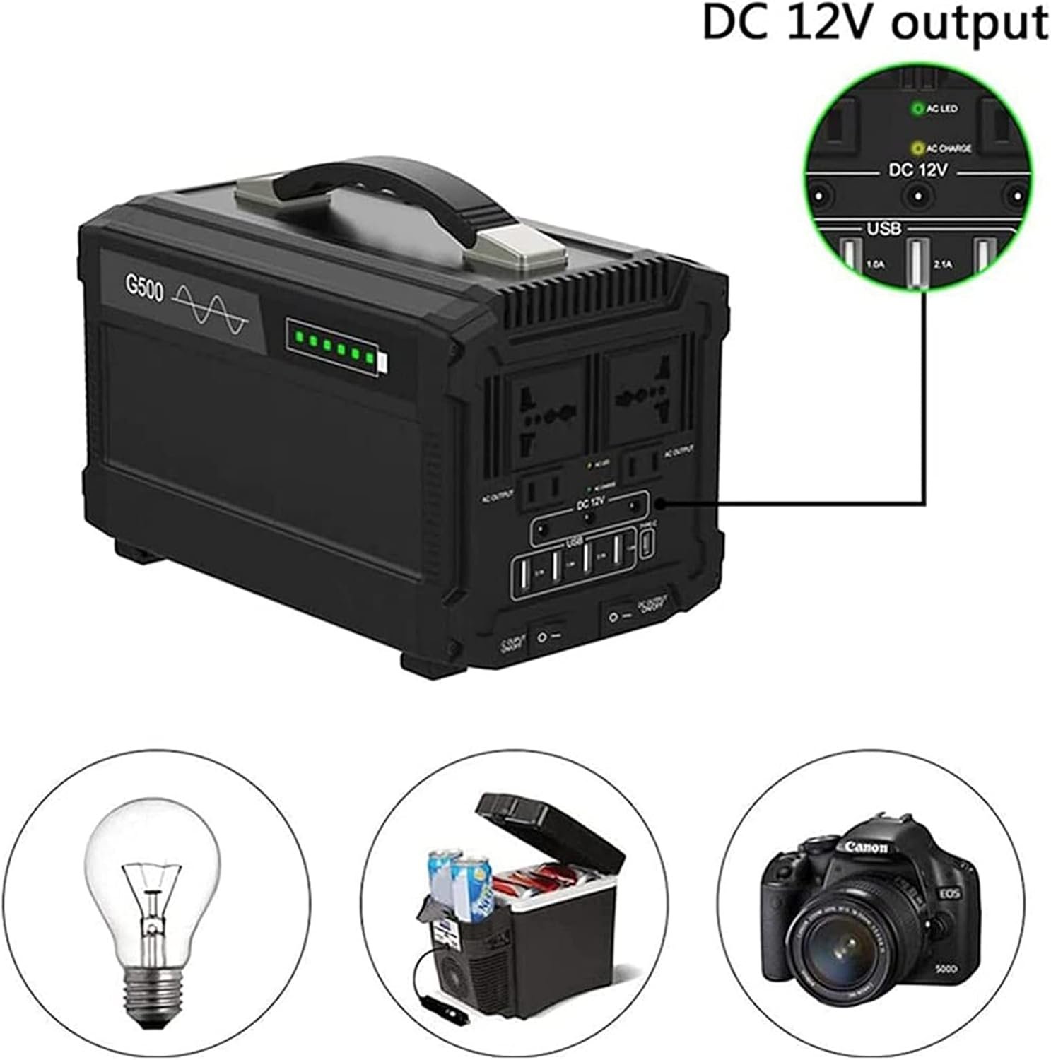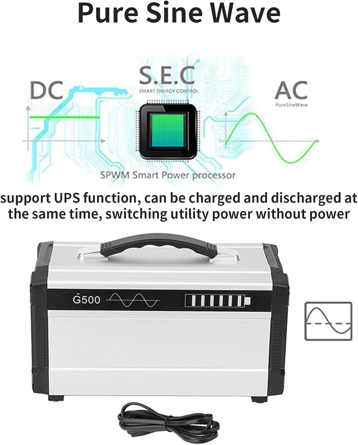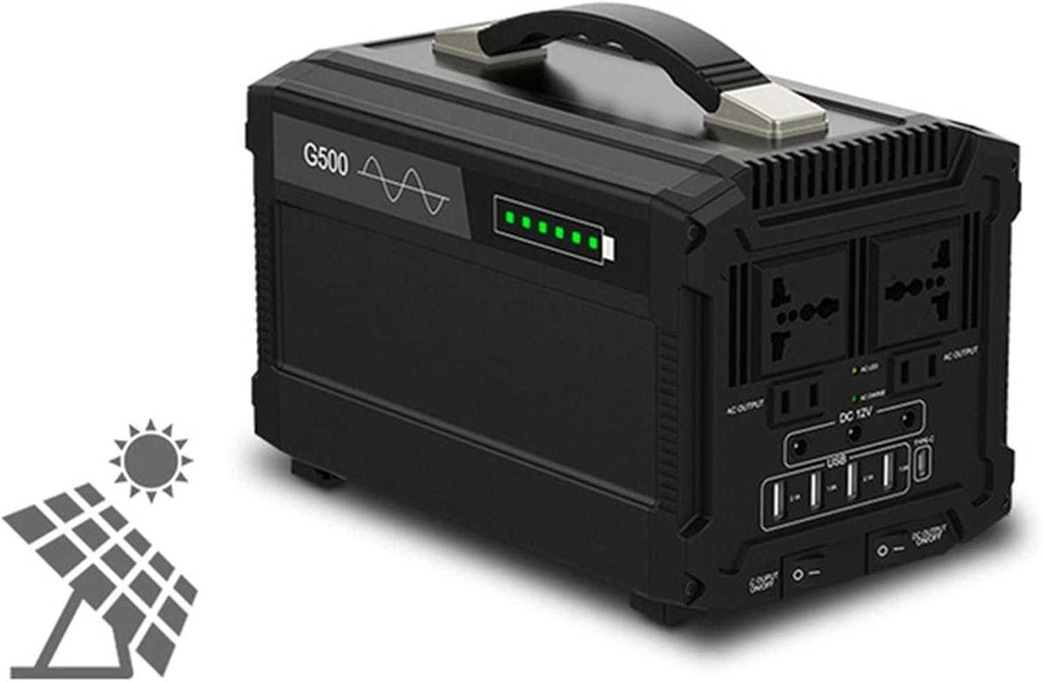 500 W/120000 mAh high-quality power lithium-ion battery portable energy storage power supply▶Pure sine wave 120000 mA large-capacity portable emergency power station▶4 x USB, 3 x DC, 4 x AC multi-function output ports, meet the use of various electrical appliances▶External fuse design, easy to replace▶Support three charging methods, convenient to deal with various situations▶Non-slip handle, in line with artificial body science, making your travel easier【Power station specifications】Battery type: Lithium ion batteryWaveform: pure sine waveBattery capacity: 120AH/ (444Wh)Rated power: 500 WCharging time: 9~10 hoursAC output: 100V~110V 60Hz/220V~240V 60Hz * 4USB output: 5V 2.1A * 4DC output: 12V 8A max * 3Type-C: 5V/3ASolar charging: 13V~23V 6.2A max【Packing list】1 x portable power station1 x charger1 x car cigarette lighter interface1 x manual1x car charger【note】1. Use the original power cord to charge, the AC charging indicator lights up red when charging, and turns green when fully charged.2. Solar panel charging, the solar panel power should be less than 18V/150W, the charging indicator is red when charging, and it turns green when fully charged.3. Car charger, please use 12V car charger, 24V car charger is prohibited.